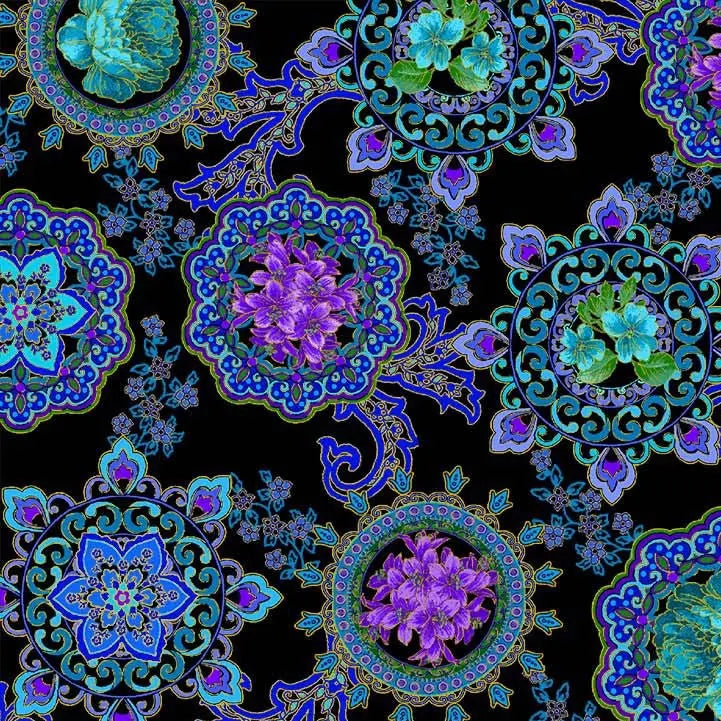 Black Opulent Medallion Cotton Wideback Fabric Per Yard